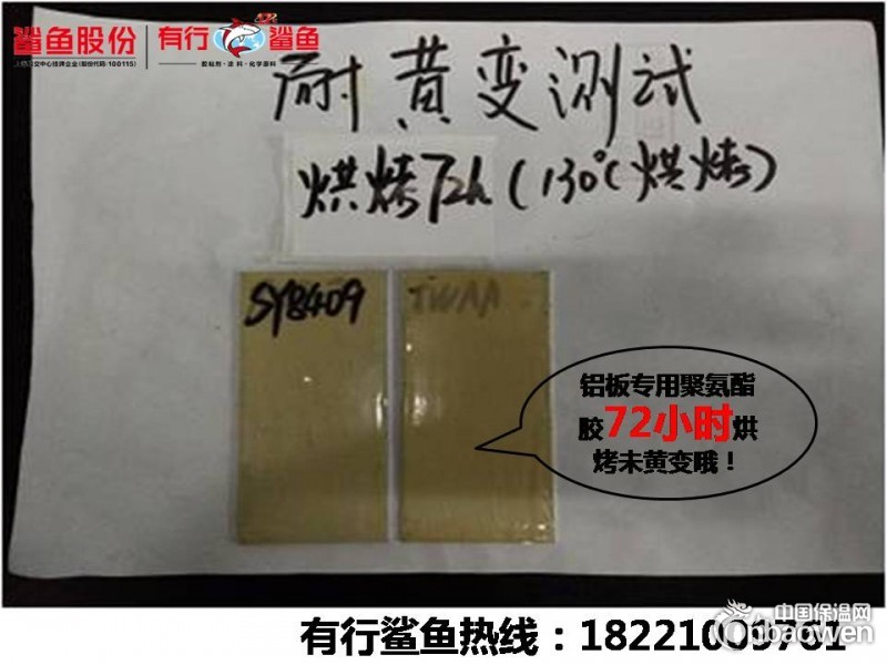 本品是属于改性无水 PU胶,粘接强度高,稳定性优良、不发泡,抗老化、抗冲击、耐水性能优良。适用于彩钢板、铝板、玻镁板、铝蜂窝、 PE、PP蜂窝等材质的粘合,石材与铝芯复合板材的粘合(解决了该领域用普通聚氨酯胶强度不够,用环氧胶板材会变形等问题),广泛应用于建筑装饰材料行业,汽车箱体行业。成品符合欧盟 ROHS,GB/T-18583-2008等有害测试标准。
